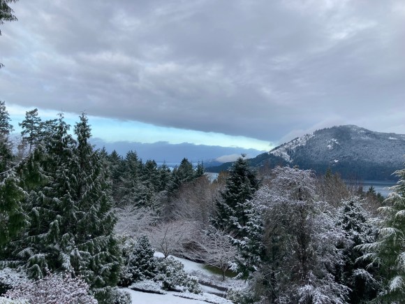 Bit of snow – not too serious yet. That almost looks like a chinook arch over Cowichan Bay, but we don’t have those here!